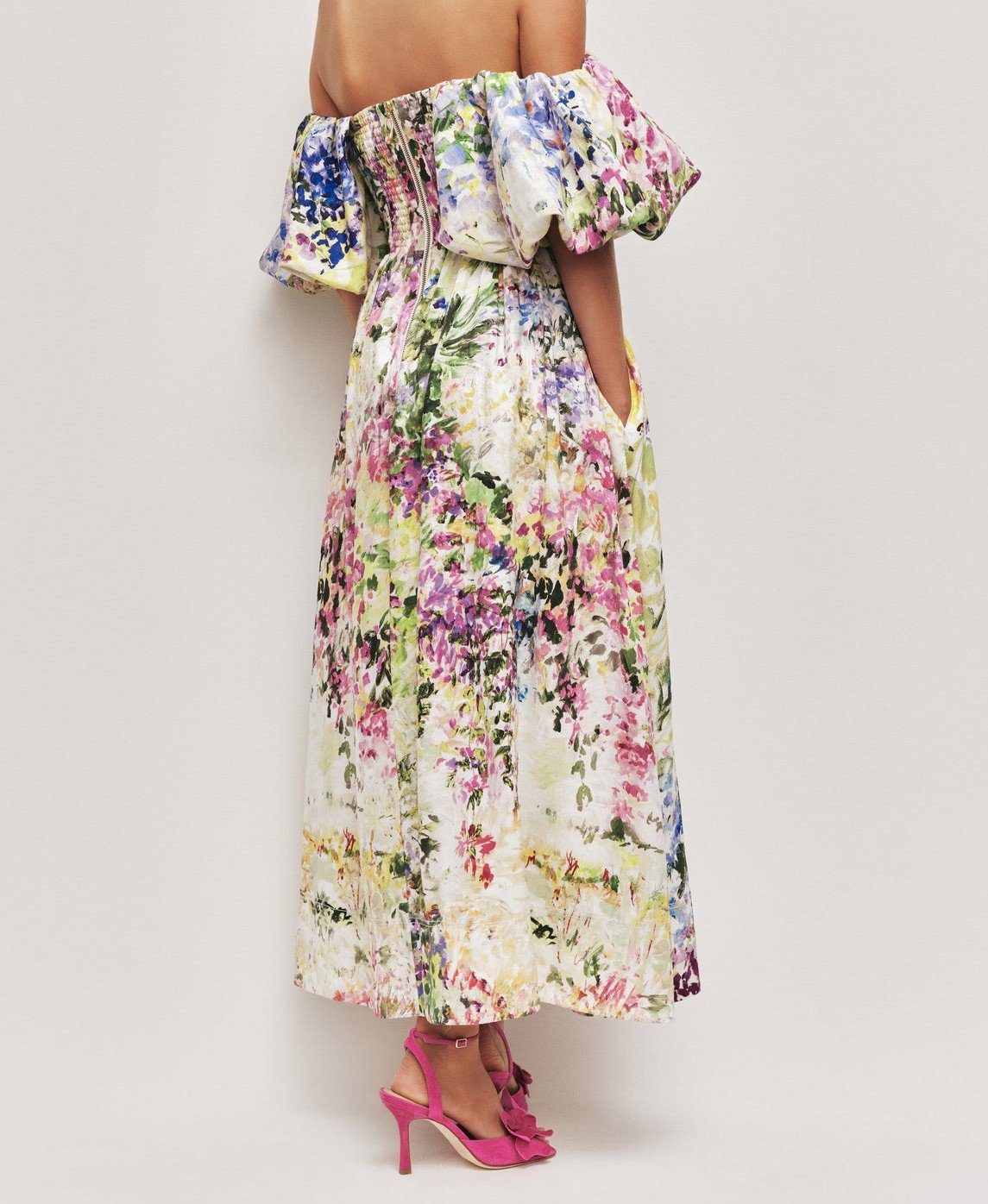 - puffed sleeves that elegantly drape off shoulder